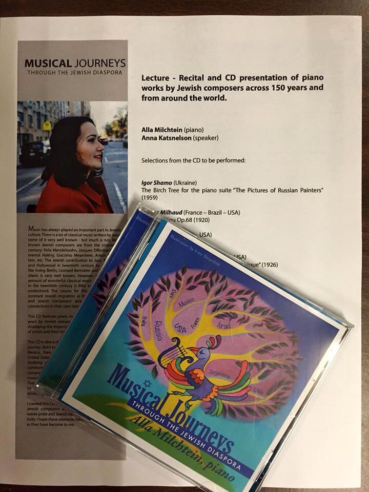 “Musical Journey through the Jewish Diaspora” is a CD recording of piano works by Jewish composers across 150 years and from around the world. The event was a CD presentation and Lecture-recital.