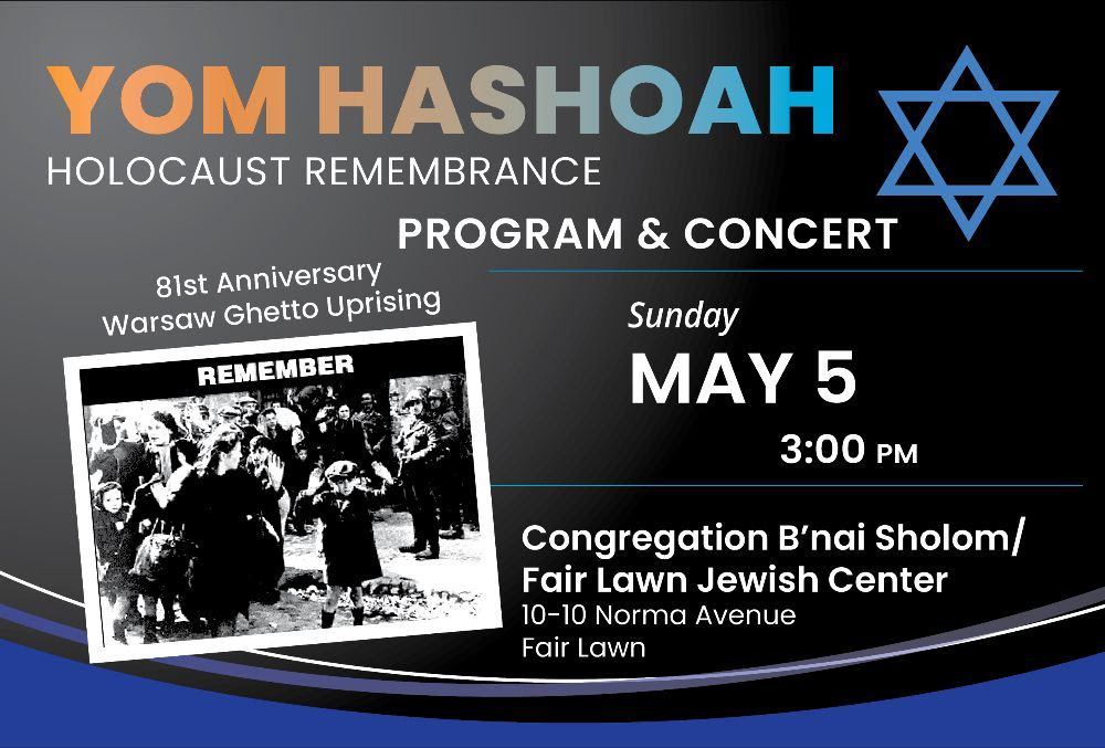 Jewish Federation of Northern NJ presents: Yom HaShoah Program and Concert Sunday, May 5th, @3PM Congregation B’nai Shalom/Fair Lawn Jewish Center, 10-10 Norma Avenue, Fair Lawn, NJ Join Jewish Federation of Northern NJ for a journey of music written during the Holocaust. “Holocaust Music Lost & Found” shares music written during the Holocaust in concentration camps […]