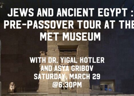 BESEDA:COJECO Jewish Intellectual Circle JEWS AND ANCIENT EGYPT: PRE-PASSOVER FAMILY TOUR AT THE MET MUSEUM WITH DR. YIGAL KOTLER AND ASYA GRIBOV Saturday, March 29, 6:30 PM We invite families to the Metropolitan Museum of Art to a unique program for parents and children ages 8 and up. Dr. Yigal Kotler, Jewish educator and historian, will […]