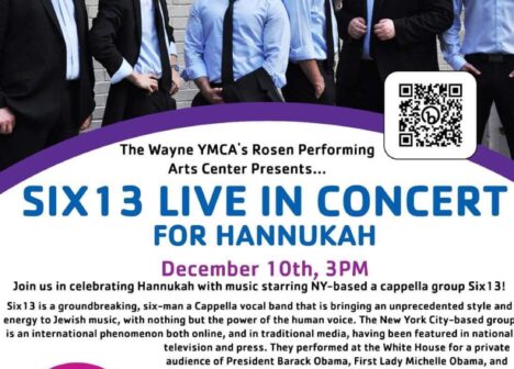 Six13 Live in Concert for Hanukkah! December 10 @3PM @ Wayne Y Join us in celebrating Chanukah with music, starring NY-based a cappella group Six 13! This event is sponsored by the Jewish Federation of Northern NJ and Herbert L. Cole and Donna S. Cole Memorial Fund. Tickets are $36; $45 at the door (if […]