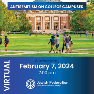 Jewish Federation of Northern NJ presents: Antisemitism on College Campuses Wednesday, February 7th, @7PM Join Jewish Federation of Northern New Jersey for a virtual free seminar on Antisemitism on College campuses. Topics include: Israeli history, student rights, safety, communication, what Antisemitism looks like on campus, and more! Sign up HERE!