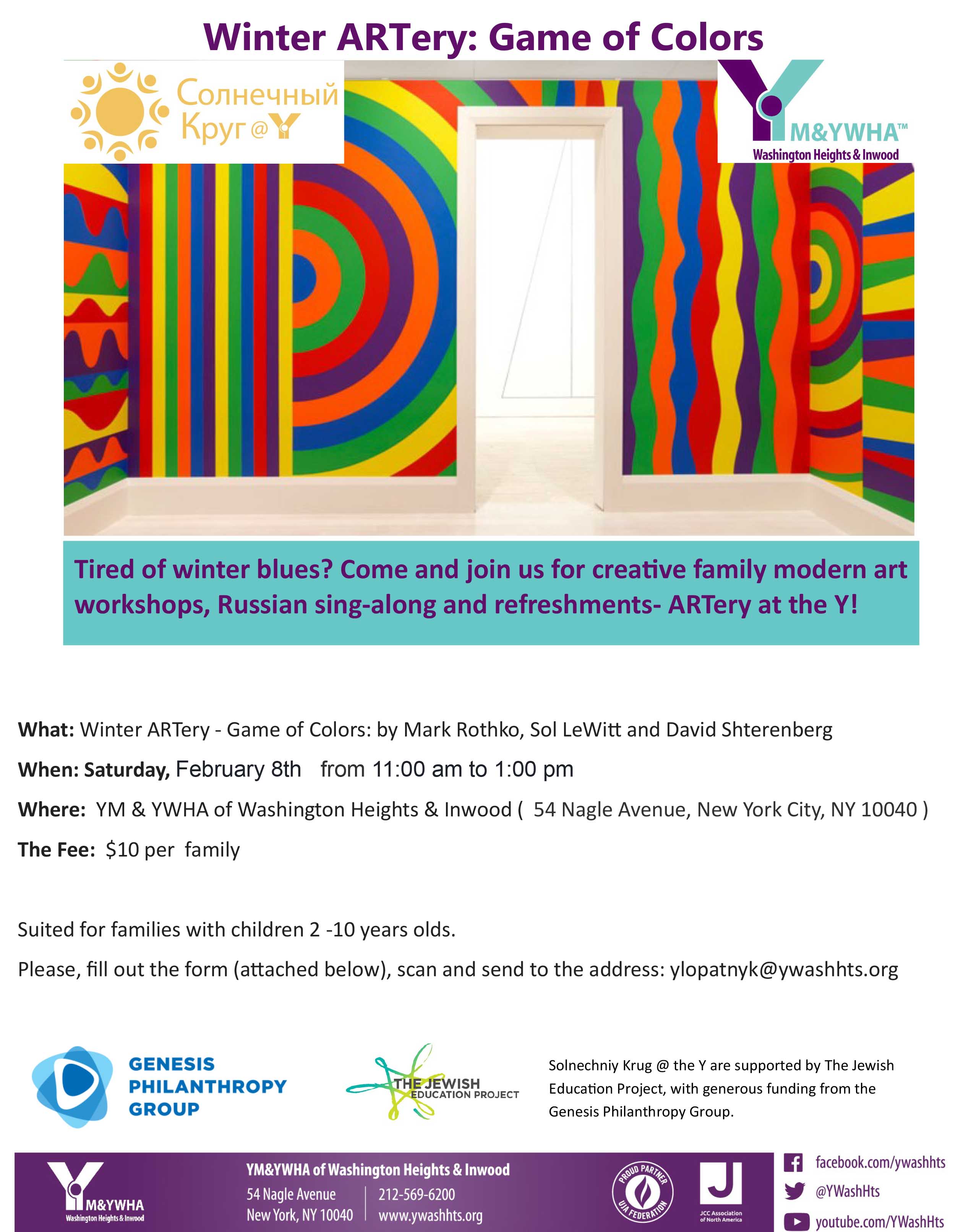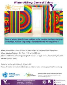 YM & YWHA of Washington Heights & Inwood Presents: Winter ARTery: Game of Colors ARTery is a program for kids and their parents about Jewish Artists and Modern Art in Russian. Tired of winter blues? Come for a creative family modern art workshops from amazing educators Maria Dinor and Beth Freynk, sing-along from Lopatnik Zhenya, and refreshments – ARTery at the Y. Suited for families with children 2 -10 […]